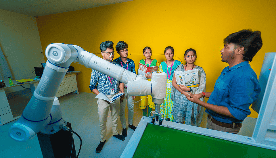 The lab focuses on integrating mechanics, electronics, and programming to create real-world solutions for industrial automation, smart manufacturing, healthcare, and service robotics. Equipped with modern tools such as Cobot, sensors, actuators, microcontrollers, PLCs, and robotic platforms, the lab helps students build practical skills aligned with current industry needs.