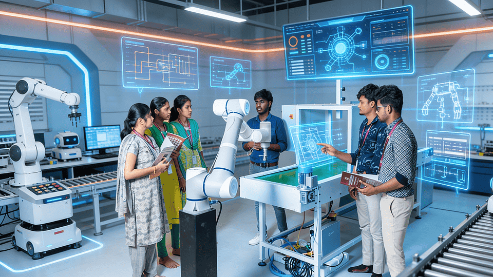 Intensive hands-on programs introduce students to robot programming, PLC automation, sensor integration, and system troubleshooting through real-world use cases.